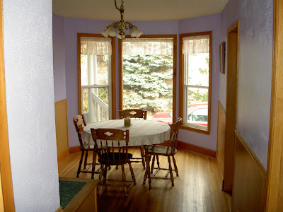 Here is a pretty good picture of the dining room in B and K's new house. I am standing in the nursery when taking this picture. This will give you a good idea of the purple that was in this area. It is now a creme whitish color and looks so much better.