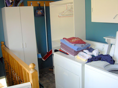 I forgot this great picture yesterday when I was posting pictures. Look at this great organizational effort of the laundry room. The book case wouldn't fit down the stairs so we improvised and now it can be used to hang clothes in the laundry room.