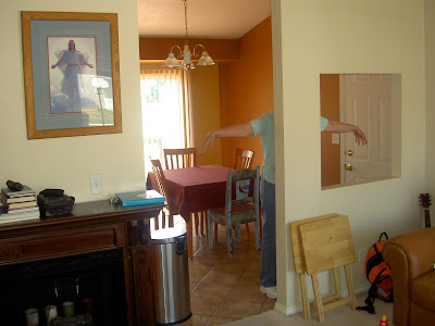 This is a picture from the living room of J and T's place. The false fireplace was moved by me and Ted into the basement right before we left this afternoon. I'm standing in the living room shooting into the dining area.