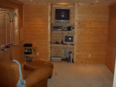 This project took Ted and I most of the day on Saturday. We rebuilt the entire shelving unit to fit the components J and T had. The previous owners had a big screen TV in this area. Needless to say it looks entirely different now. This is the basement family room.