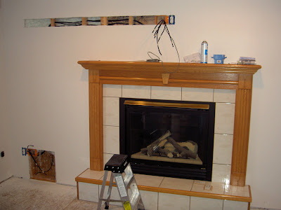 My latest project pictures. Today, actually yesterday, I decided to make the mess in the family room even more unsightly. These pictures pretty much tell what I've been up to. I decided that while the room is a mess anyway why not wire it for a flat panel plasma or LCD TV to put above the fireplace. Not to say I can afford to buy one but at least it will be flat panel ready. After I'm finished the temple picture can go back up and you'll never be able to tell that I made this big mess.